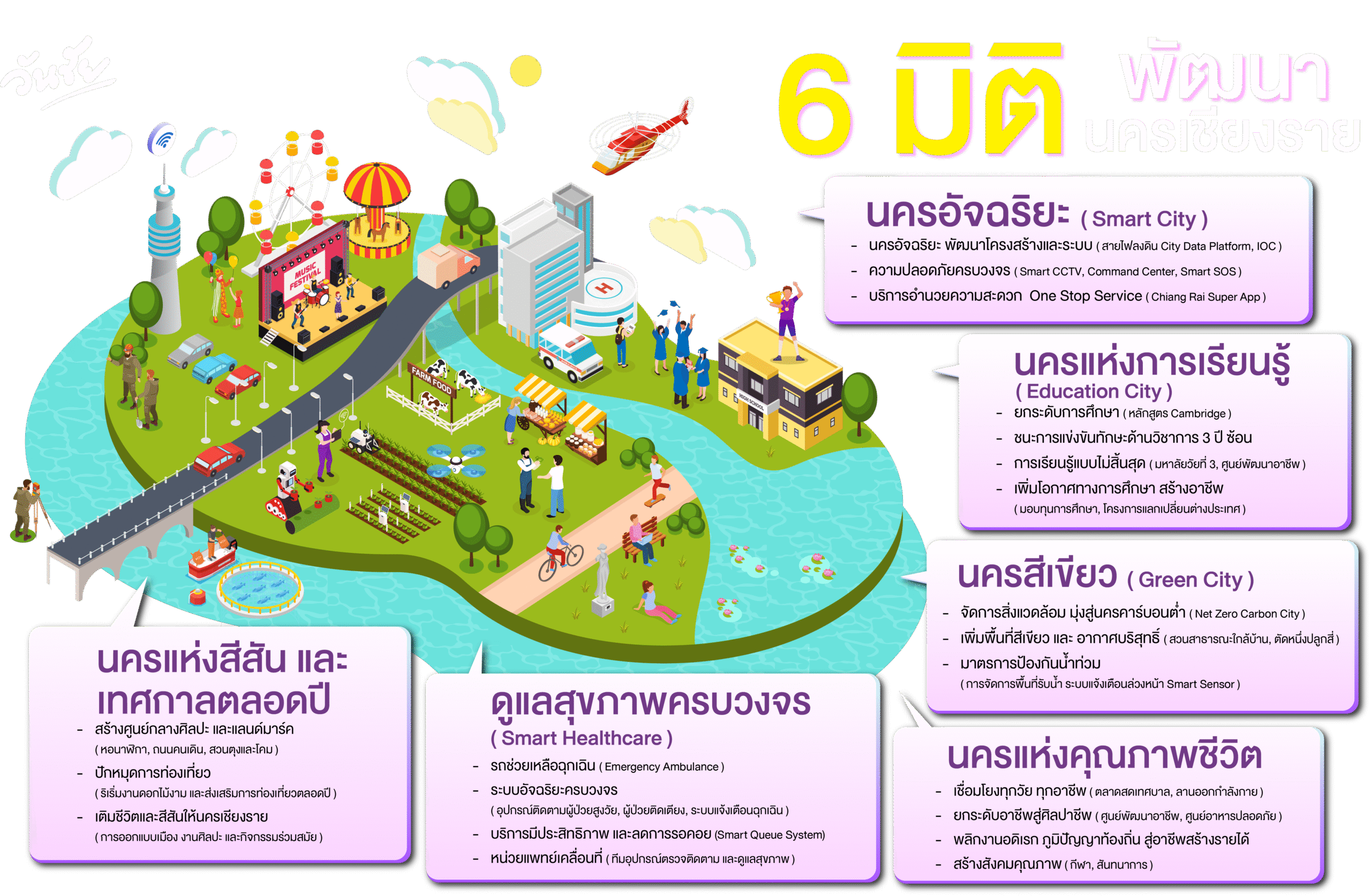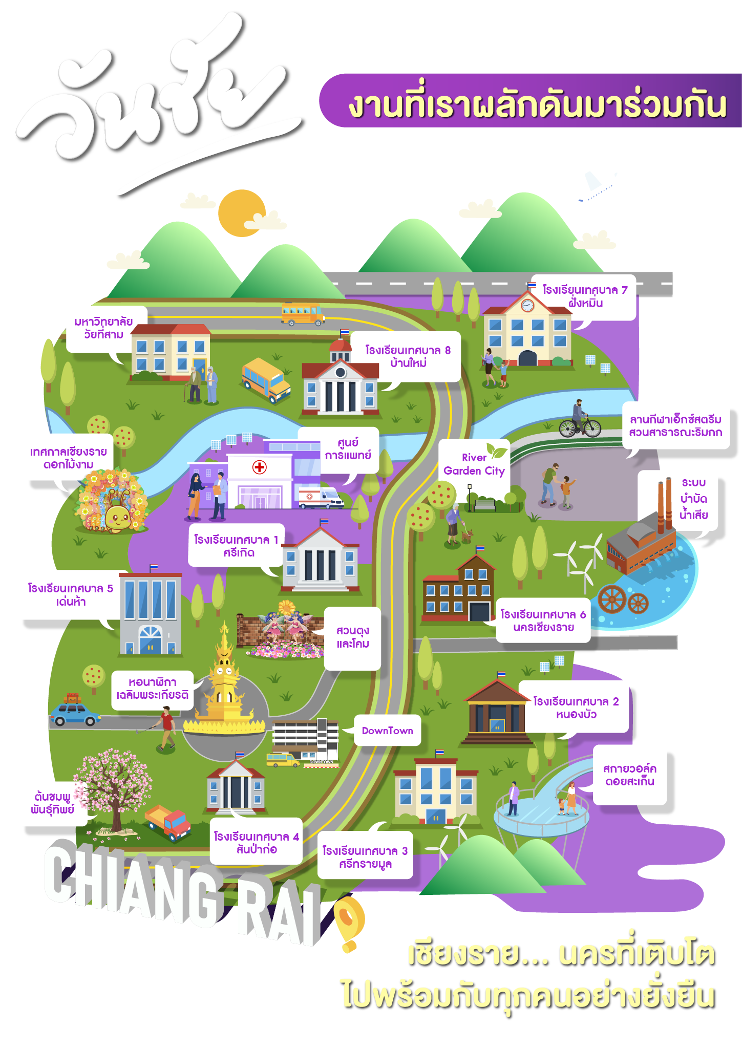 เราสามารถร่วมกันพัฒนาเชียงรายให้ดียิ่งขึ้น ด้วยการสนับสนุนโครงการที่เป็นประโยชน์ต่อส่วนรวม ร่วมกันดูแลสิ่งแวดล้อม และผลักดันให้เชียงรายก้าวสู่ smart city เมืองที่มีระบบบริหารจัดการที่ทันสมัย และเป็นต้นแบบของเมืองคุณภาพในอนาคต